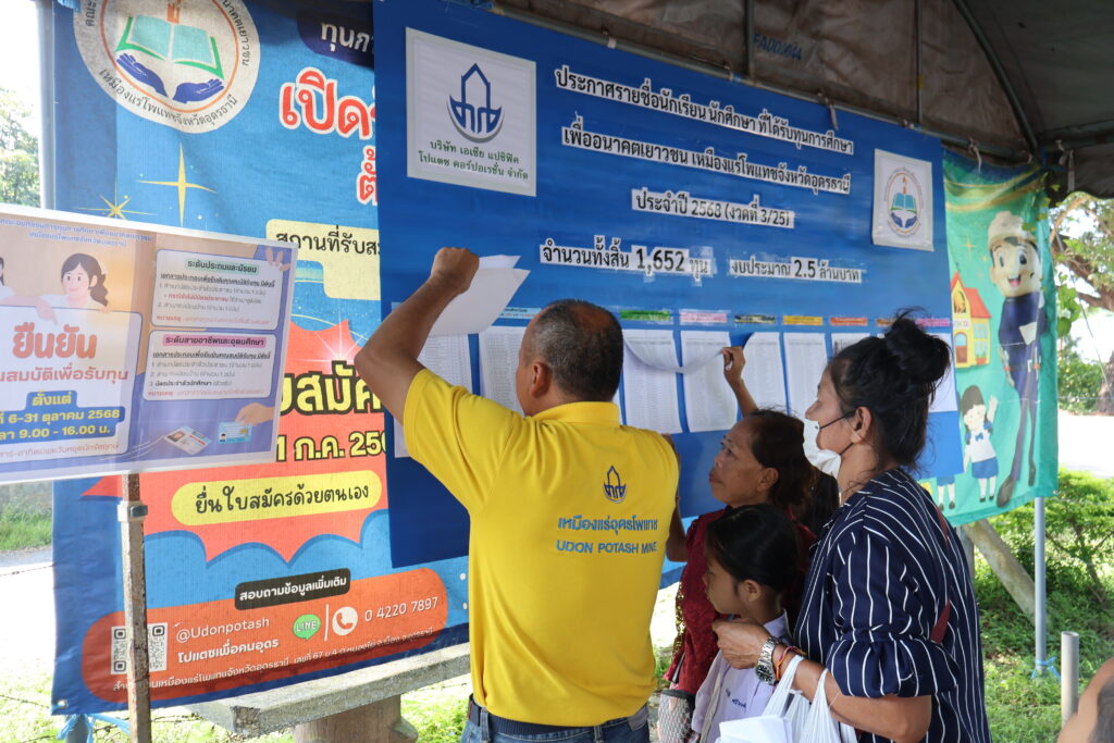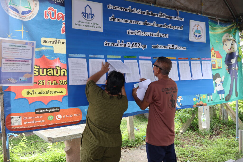 ทุนการศึกษาเพื่ออนาคตเยาวชน เหมืองแร่โพแทชจังหวัดอุดรธานี เป็นหนึ่งในเงื่อนไขในการออกประทานบัตรของกรมอุตสาหกรรมพื้นฐานและการเหมืองแร่ ที่กำหนดให้บริษัท เอเซีย แปซิฟิค โปแตซ คอร์ปอเรชั่น จำกัด ผู้ดำเนินโครงการเหมืองแร่โพแทชจังหวัดอุดรธานี จะต้องถือปฏิบัติอย่างเคร่งครัด เพื่อส่งเสริมสนับสนุนทุนการศึกษาให้กับเยาวชนและสถานศึกษาที่อยู่ในเขตประทานบัตร ได้แก่ ตำบลโนนสูง ตำบลหนองไผ่ ตำบลหนองขอนกว้าง อำเภอเมืองอุดรธานี และ ตำบลห้วยสามพาด ตำบลนาม่วง อำเภอประจักษ์ศิลปาคม ตลอดอายุประทานบัตร 25 ปี มีวงเงินงบประมาณจำนวน 60 ล้านบาท
